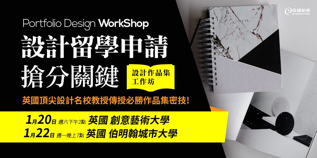 1月份,英國頂尖設計名校教授親來台,現場解析作品集創作重點、如何整理想法/分類作品,掌握製作訣竅,讓你的作品集從茫茫人海中脫穎而出,並在互動學習中,實際接觸海外設計新思維,預先感受海外設計大學/研究所的學習模式,透過工作坊你將學習到: