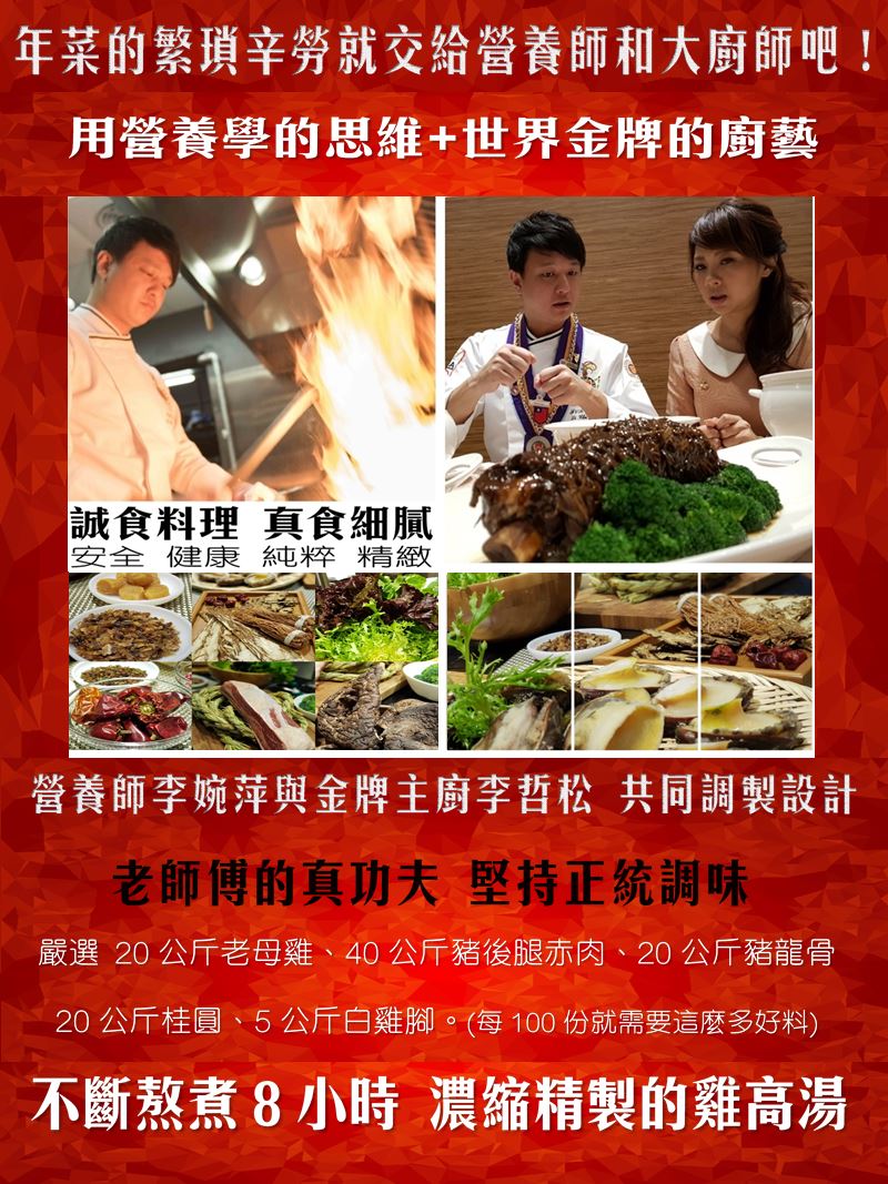 謝謝您購買經典健康年菜,對於食材的把關,料理的口味,我們一步都沒有退讓,希望您能吃到安全又美味的食物,是我們永遠都不會改變的初衷,因為每口食物都會成為我們身體的一部份,吃正確的食物,自然就會有健康的身體,這個簡單又重要的道理,卻常常被我們不經意的忽略了。