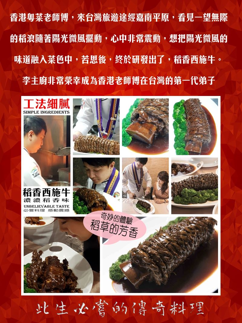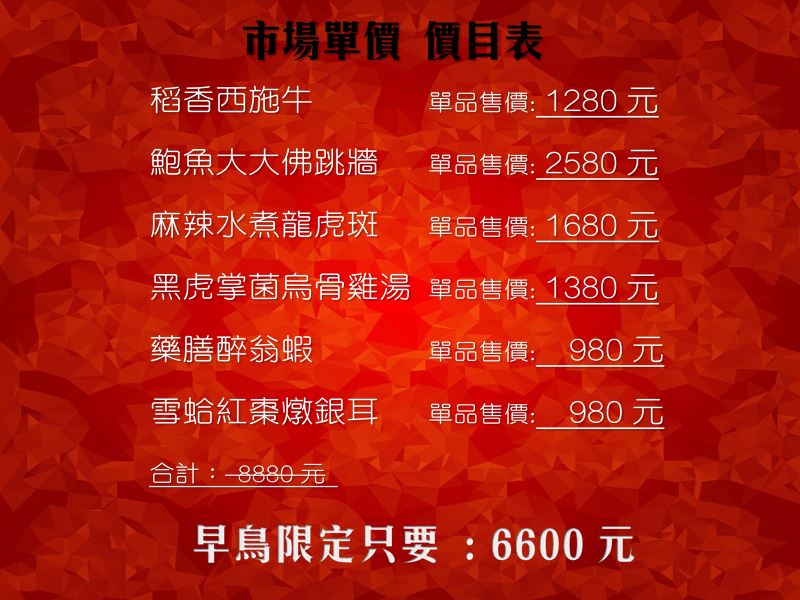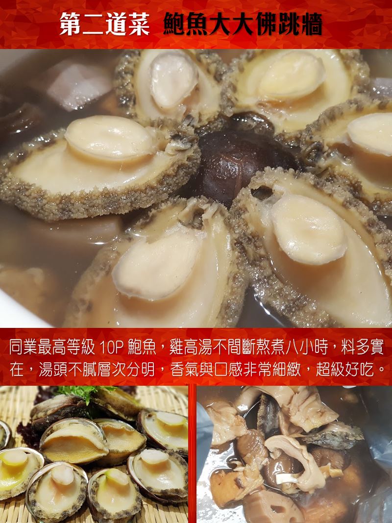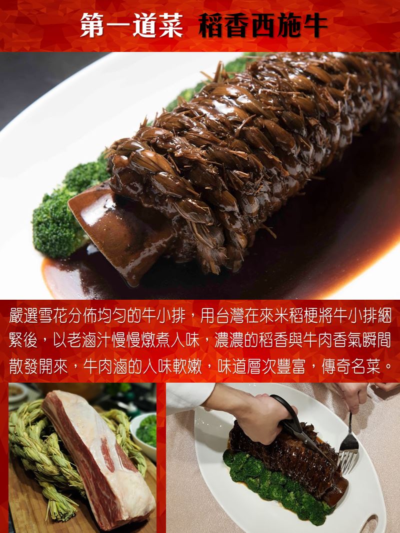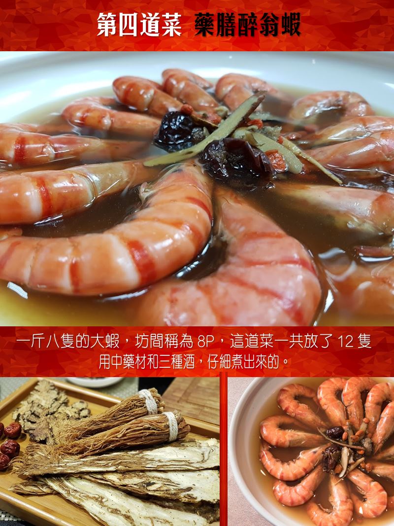 1.稻香西施牛 2.鮑魚大大佛跳牆 3.麻辣水煮龍虎斑 4.藥膳醉翁蝦
