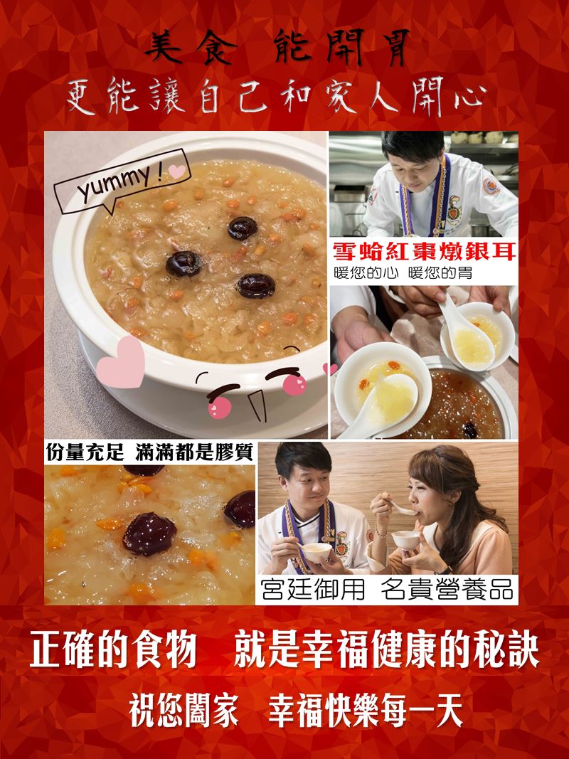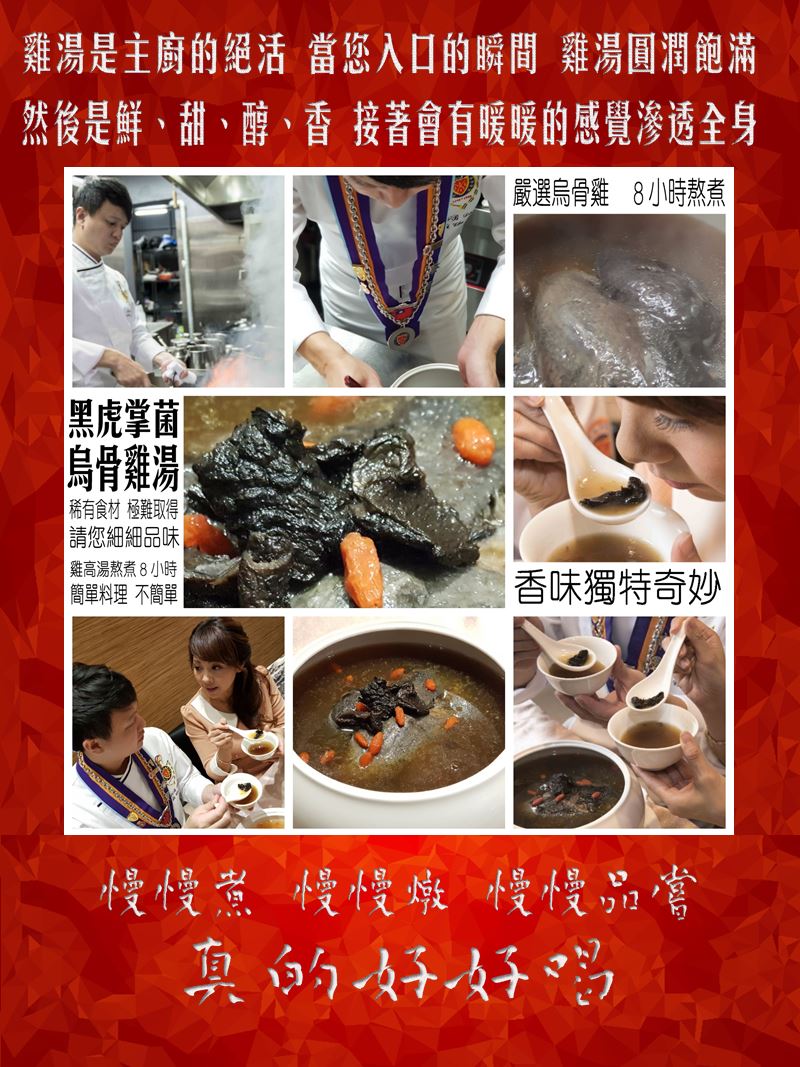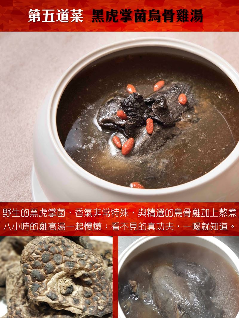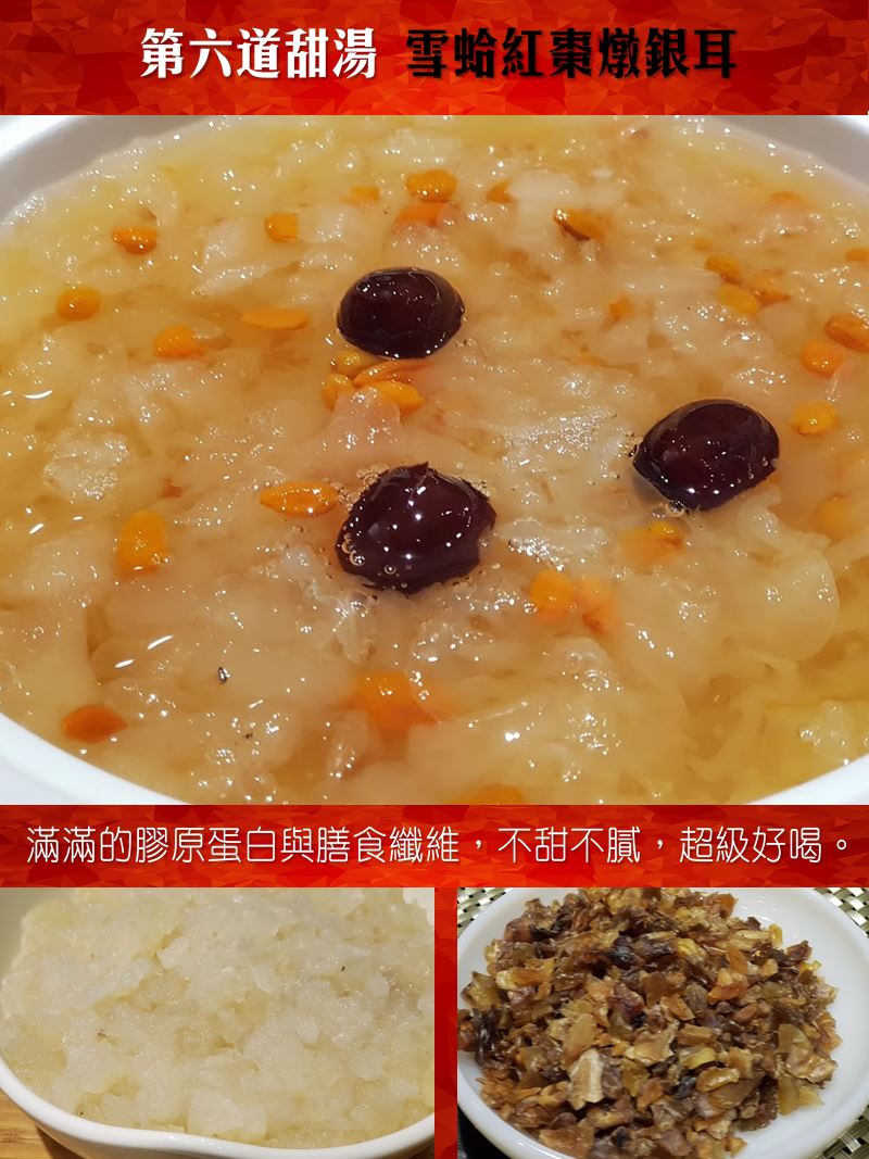 5.黑虎掌菌烏骨雞湯 6.雪蛤紅棗燉銀耳(甜湯)