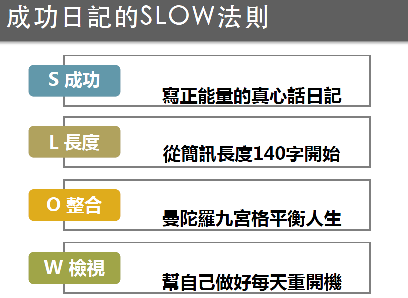 在「SLOW法則」中,會教你做得到的人生覆盤法則。