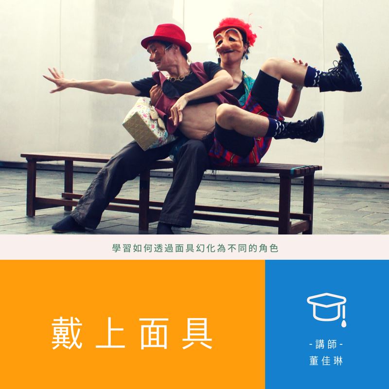 面具表演擁有悠久的歷史,演員戴上面具可以快速的變換角色,且每個表情面具本身,就包含了某些表演層次、角色性格,所以演員要用全身的肢體語言支撐起面具,讓角色的線條、情感,清楚簡單但仍充滿張力。本課程使用半臉表情面具,透過進入面具表演前,肢體、節奏的練習、面具展示、解說,帶上面具尋找面具角色的姿態、聲音,最後透過一些簡單的即興主題戴上面具表演。