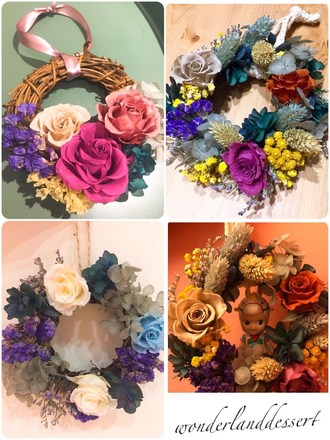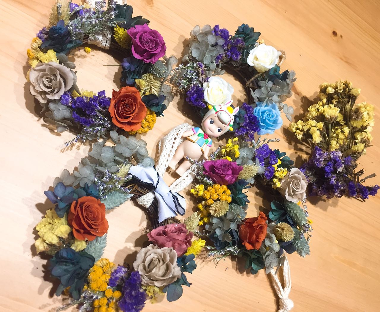 以不凋玫瑰花及繡球花為主,再搭配其他乾燥花系列,實際教材會依花市供貨情形挑選花材。