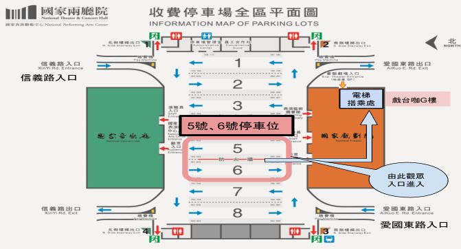 - 由信義路或愛國東路進出(限高2公尺),車輛停放 5號、6號 停車位,距離戲劇院入口較近。