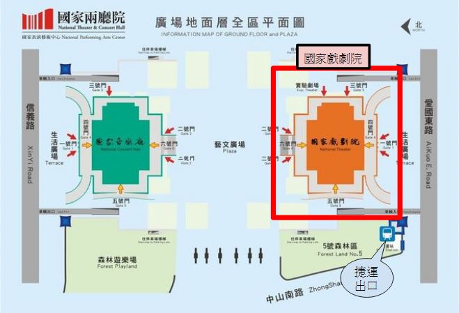(可在國家戲劇院愛國東路地面層入口下車或愛國東路一樓4號門斜坡車道下車。)