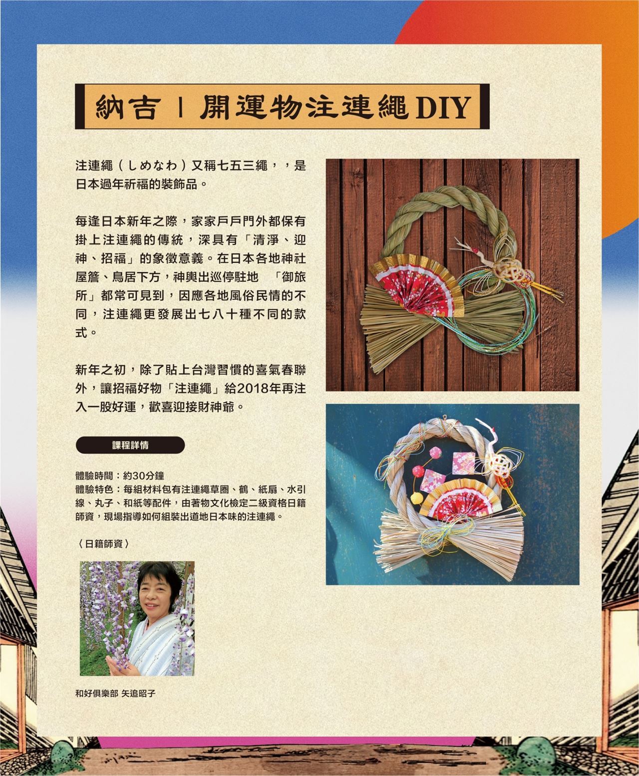 l 注連繩DIY會用到萬用膠,學齡前兒童需要家長陪同。為維護上課品質,未購票之未滿12歲兒童一場限定四名。若未事先為您的寶貝預約位置,本單位有權利拒絕兒童進入教室。