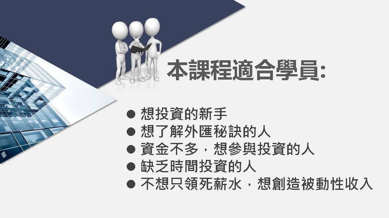 簡介:外匯是一種24小時不打烊的全球市場,每日交易量非常龐大,是個公開且透明的投資工具。學習如何以錢養錢,創造長期穩定的被動收入,每月幫自己加薪,提早實現財務自主。將十幾年外匯實務經驗用簡單、易學的方式傳遞分享,即便是完全沒有任何投資經驗的新手,也可以輕易上手。