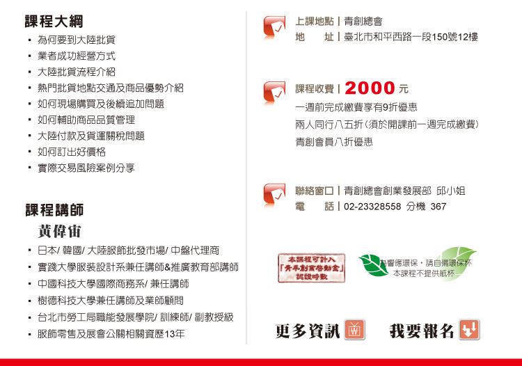 ☑ 單一課程超過1,000元以上,即贈送100元課程折價卷,可折抵下次青創學院課程費用
