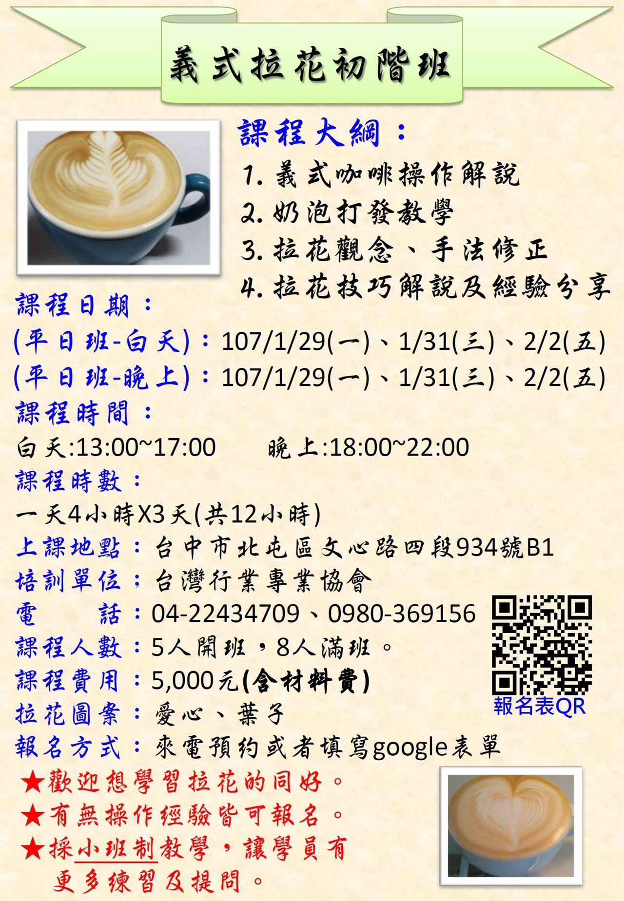 2018年台中「義式拉花初階班」平日-白天班、晚上班(將於1/29(一)開課)