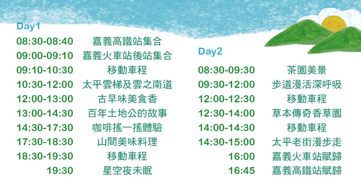 太平雲梯與周邊景點心茶遊 茶香味蕾小旅行太平四村位於阿里山北茶道入口,是進入大阿里山區的一條絕美途徑,一處群山環抱茶葉飄香的寶地。讓在地人帶路走,聽百年土地公保佑村民的故事,體驗最初心的烘豆方式,莊園品嘗精品咖啡,感受山間雲霧的變幻。在高山茶的故鄉,品一杯山間好茶的獨特好韻。【燈會抵嘉】台灣燈會在嘉義至03月11日第一天順道賞梅山太平老街的燈;第二天回程可以自行再去賞2018台灣燈會唷!