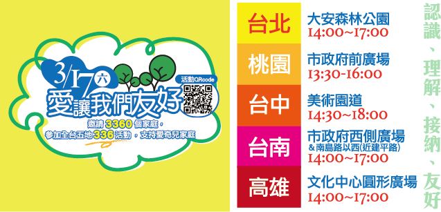 每一個特別的孩子都是我們的天使「 愛奇兒」,在台灣每14個家庭就有一個是愛奇兒家庭,而漫漫復健路,愛奇兒父母將獨自面對,「家庭」是愛奇兒照顧的永遠支持系統, 如果你曾有一刻了解孤單的感覺,是不是願意陪在這群愛奇兒的家人旁邊,用愛驅走無助,我們需要您的加入,讓我們選3月17日同一個陽光下,在這片土地上,展開我們的傳奇。