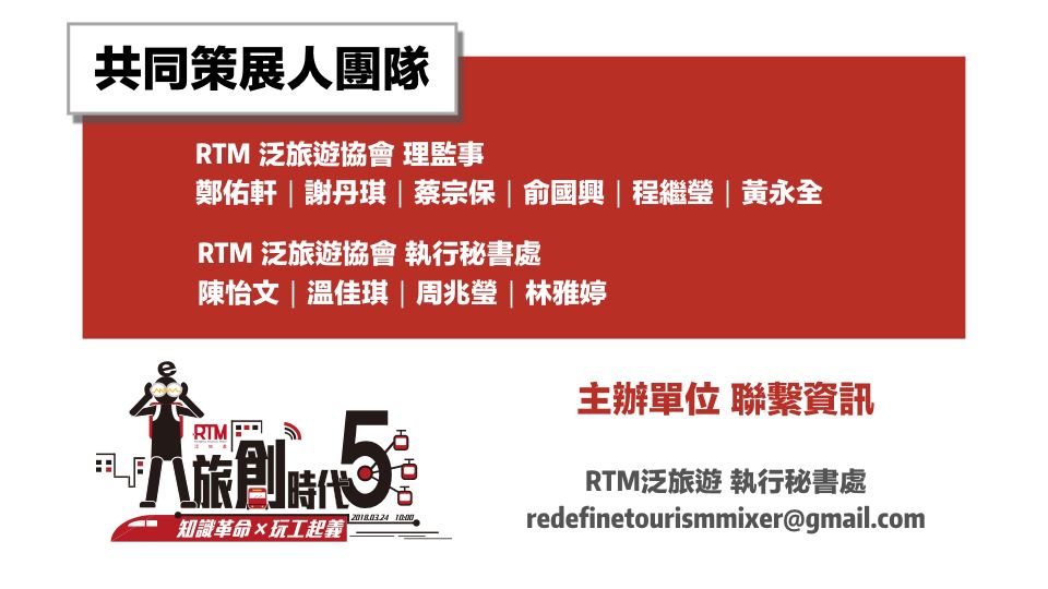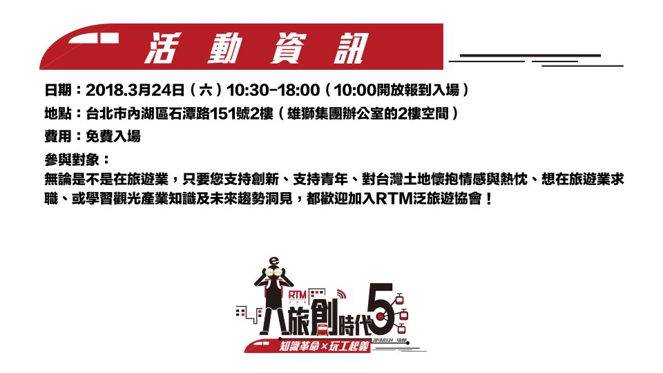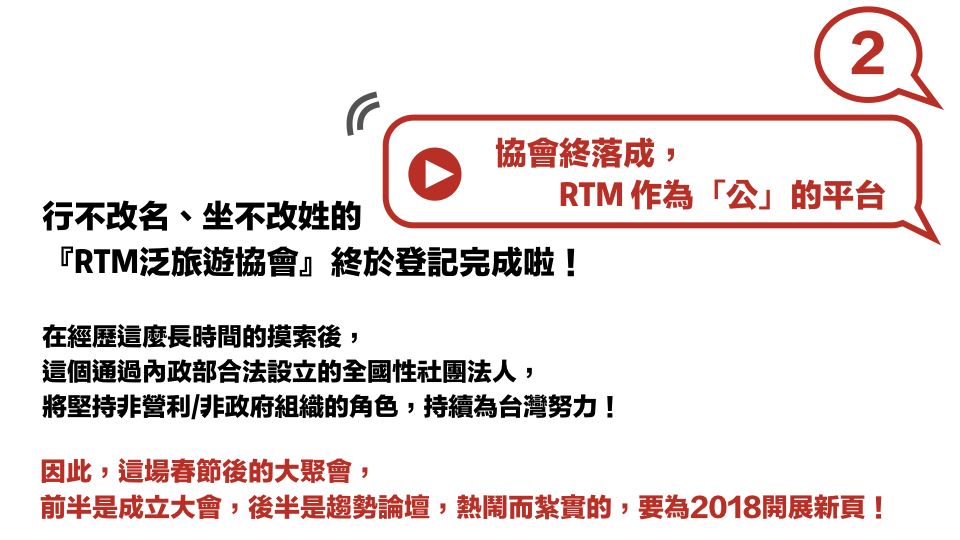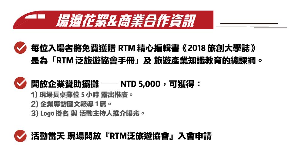 《RTM泛旅遊協會|2018年度會員入會申請》查看詳情 ▶︎ https://www.accupass.com/go/rtmmembership2018