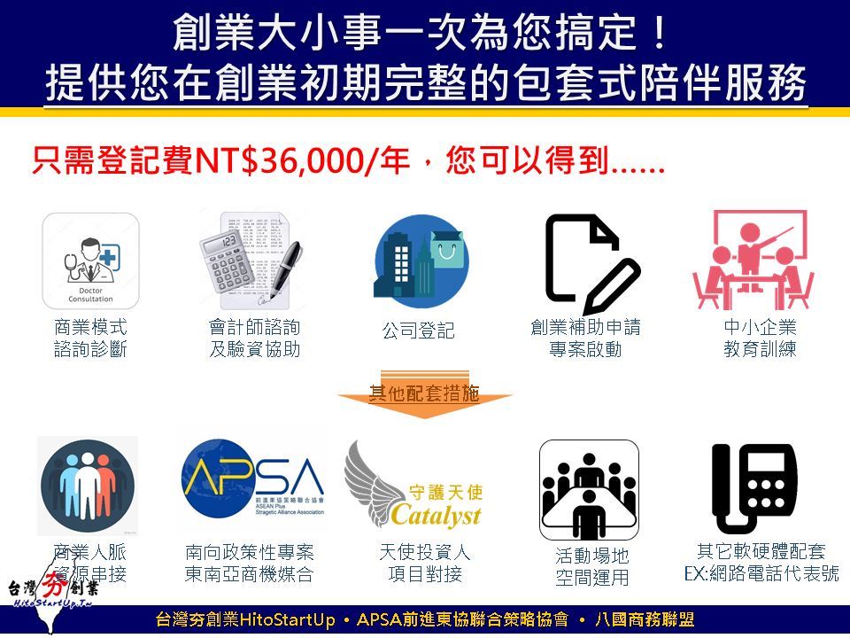 年繳NT$36,000(含稅)不收押金,另享政府補助申請免費諮詢、全程輔導及計畫書撰寫免簽約金(免前金)特惠專案。(公司登記地:新北市三重區重新路2段46-8號)