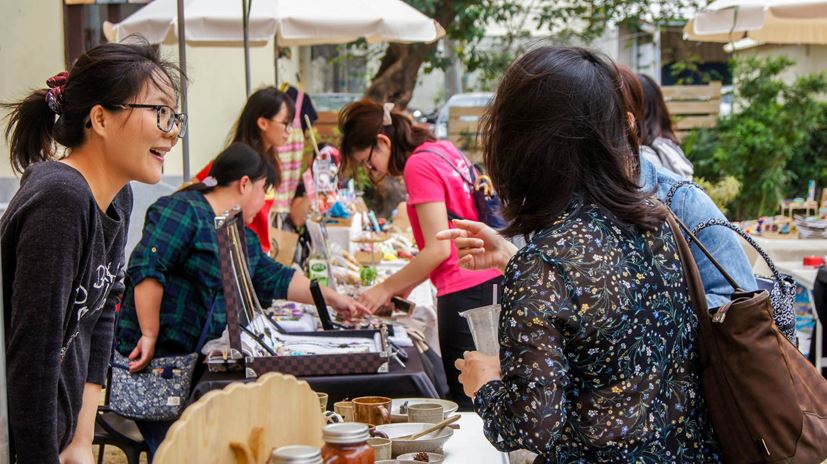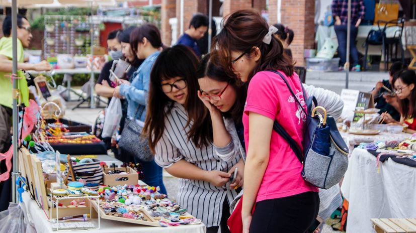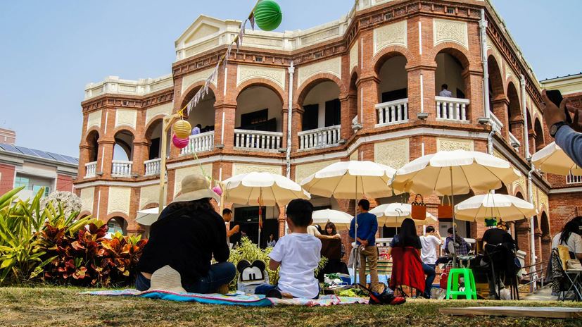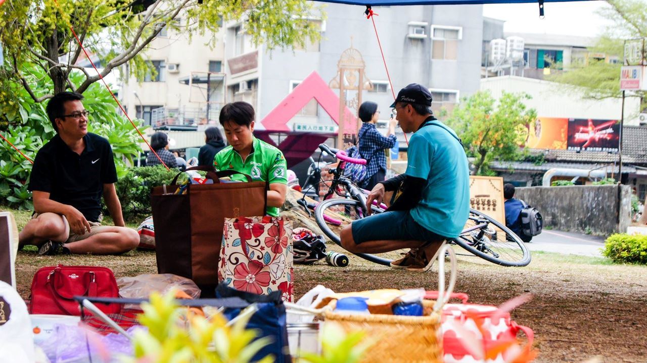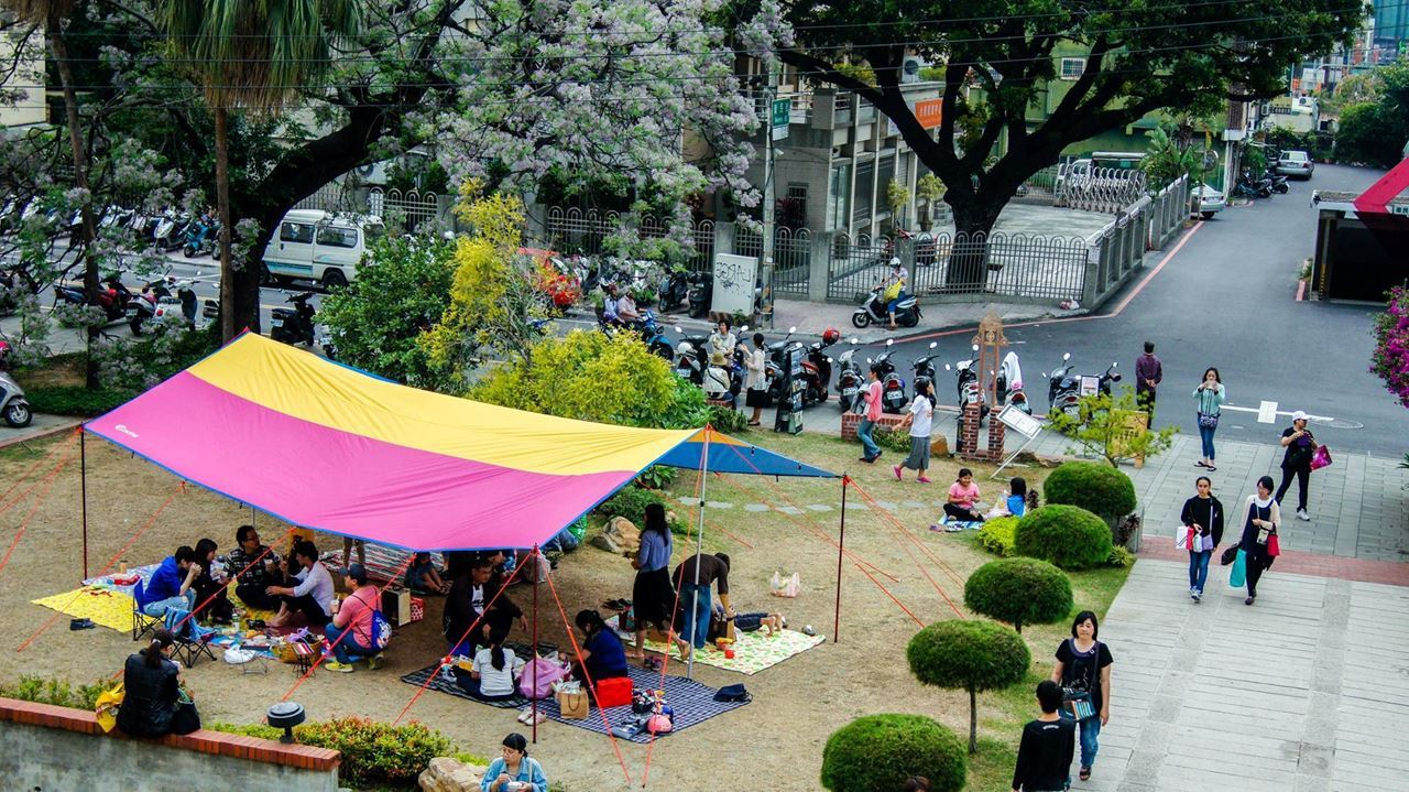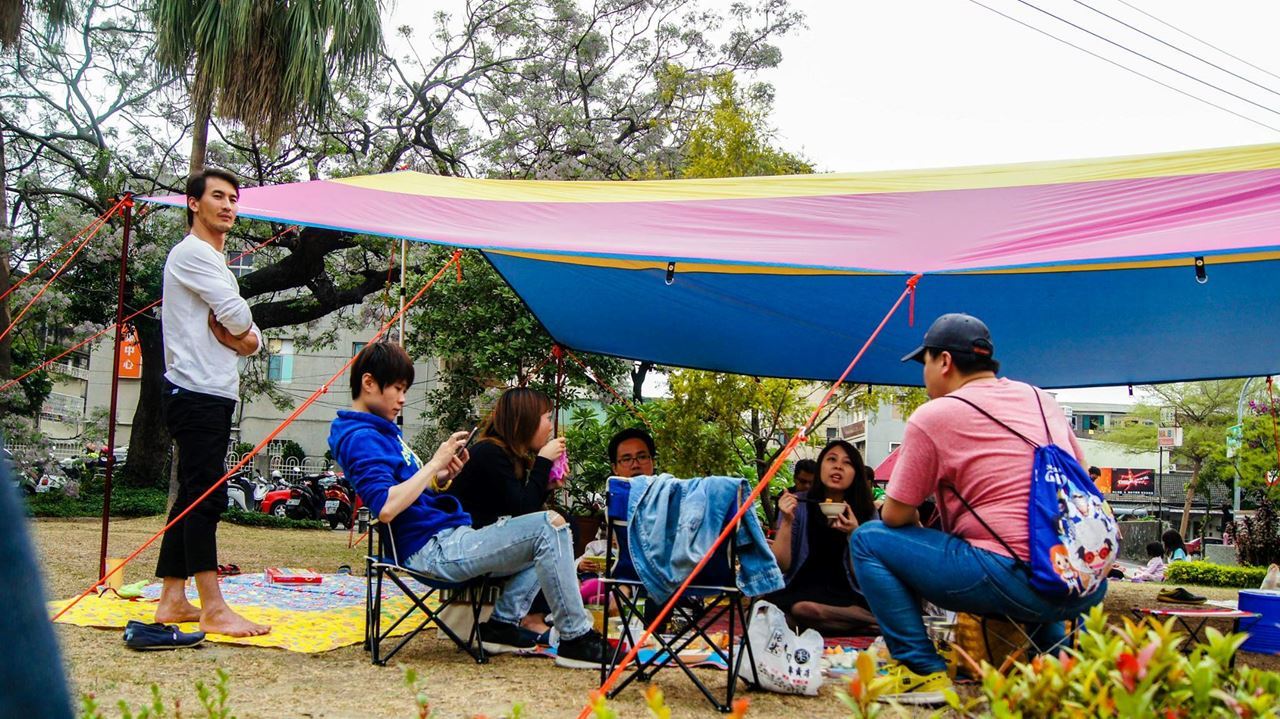 坐在綠草皮上開心聊天、吃美食、玩手作、逛市集,