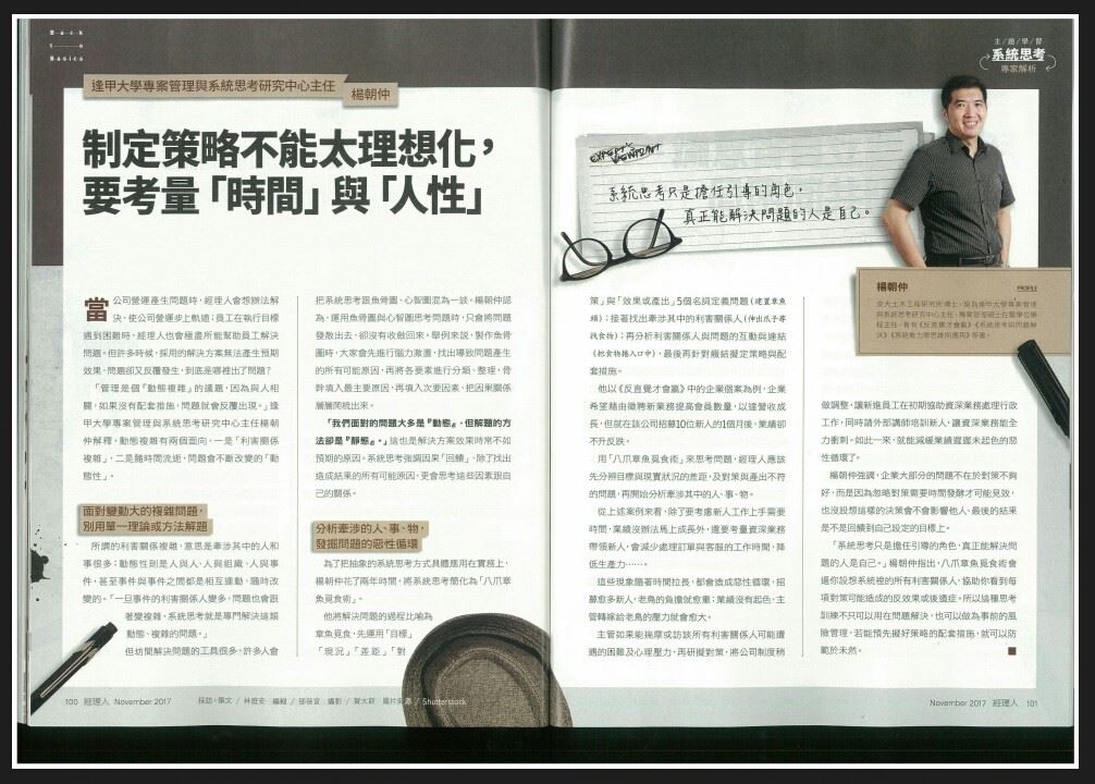 講師逢甲大學專案管理與系統思考研究中心主任楊朝仲在2017年11月經理人月刊系統思考專刊專訪文章