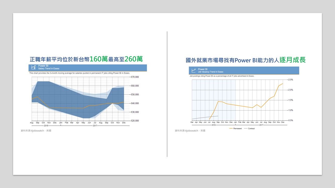 你也可以從國外最新的未來工作研究報告或台灣大企業的職缺發現,「資料分析師」是未來最HOT的工作之一!平均薪水最高可到260萬台幣,本堂課將教你如何利用報表工具以挑戰更高薪水。