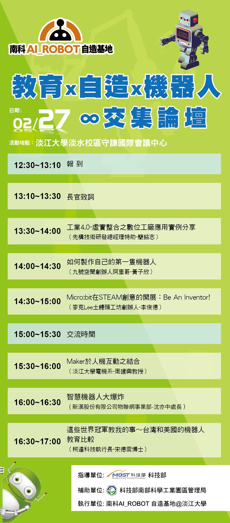 本次論壇由南科管理局指導,特別邀請到台灣多位 Maker 界重要推手與淡江大學自造社的指導老師,來分享 STEAM/SMART 教育的創新影響力,同時也邀請新創育成與業界的代表,分享從自造到新創,從新創到企業不同層級在機器人與智能 AI 上的未來的發展。讓所有對智慧機器人及自造運動有興趣的人,能彼此接觸與串聯,創造更大的自造影響力。
