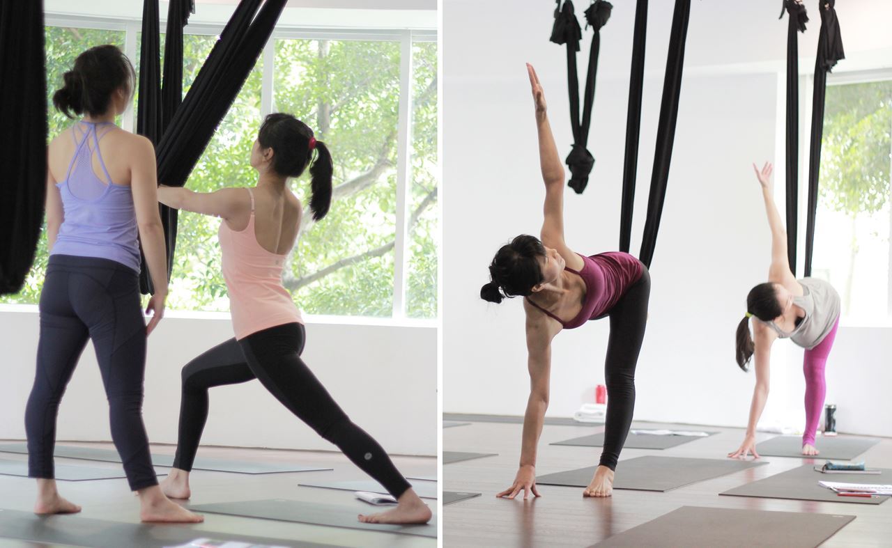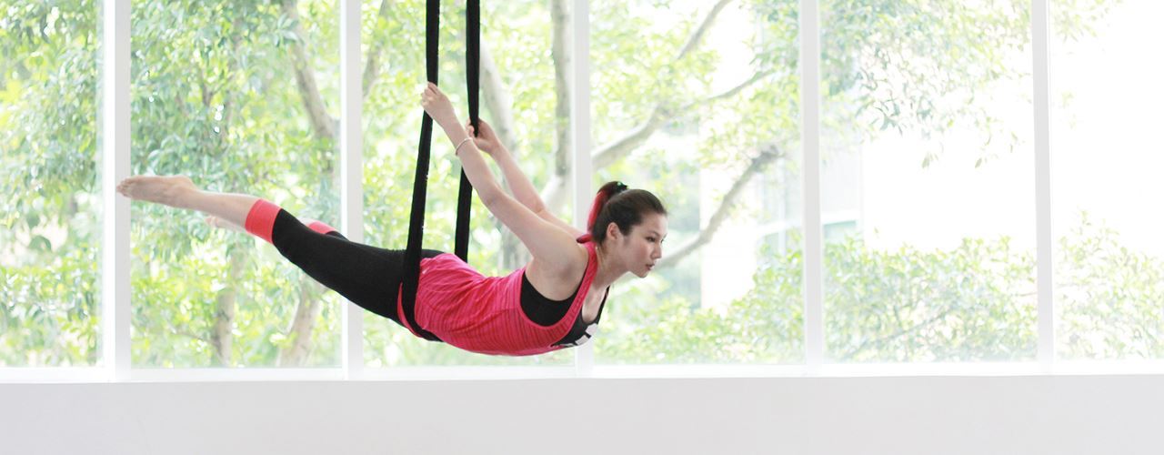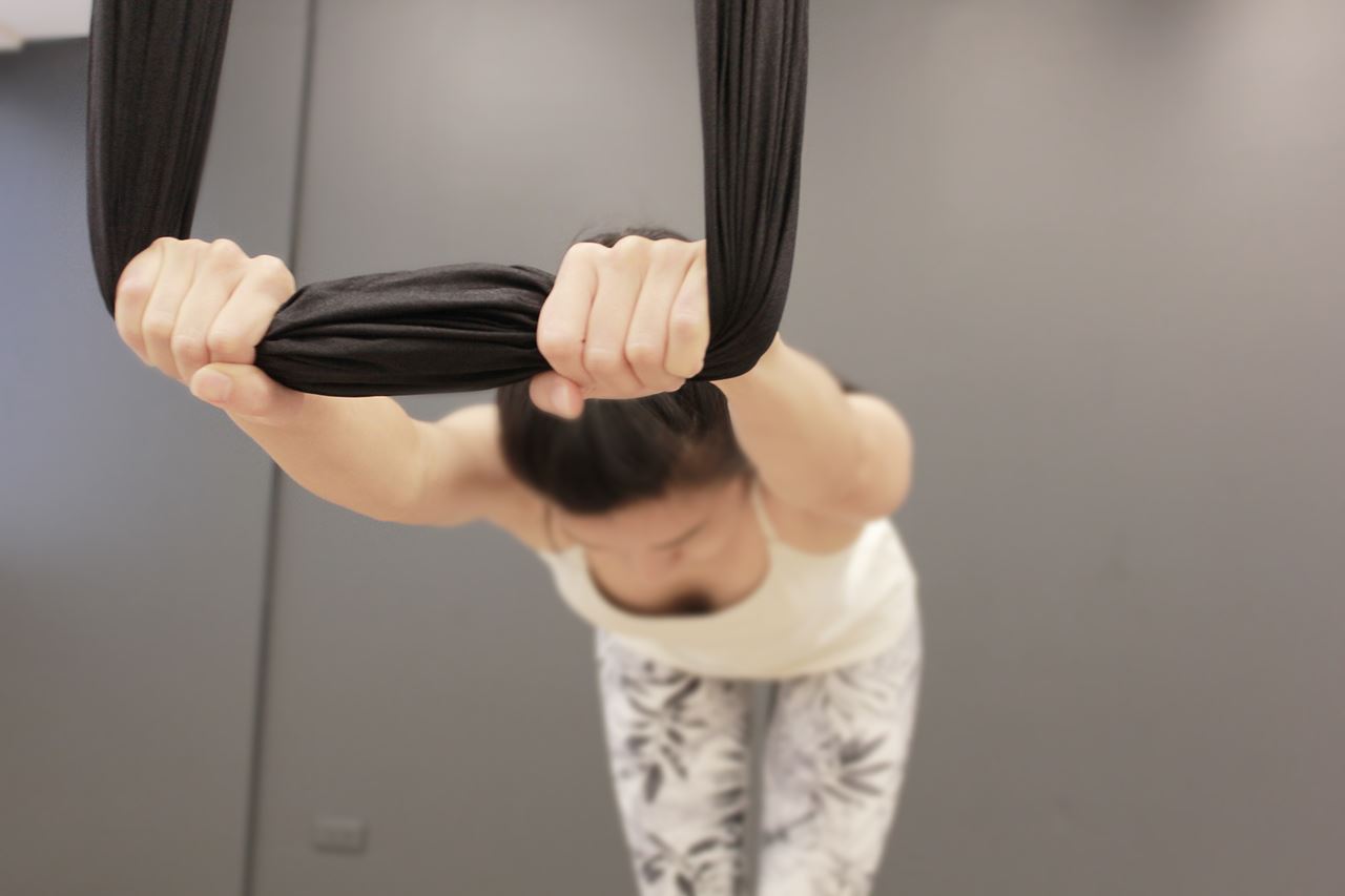 空中瑜珈是運用懸垂的絹布,藉助反地心引力與布掛支撐身體的力量,幫助我們在空中進行瑜珈練習,使平時部分難以完成的瑜珈動作變得較輕鬆,體會更深度的無壓力肌群伸展。空中瑜珈同時著重於平衡、核心、柔軟度、專注力,可幫助練習者提升全身性的協調感,有覺知的感受身體,體驗身心飛翔的輕盈舒展。