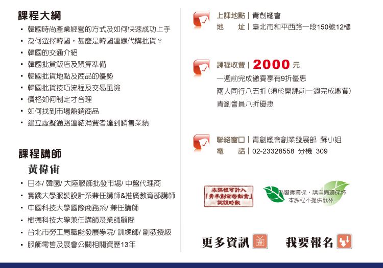☑ 單一課程超過1,000元以上,即贈送100元課程折價卷,可折抵下次青創學院課程費用