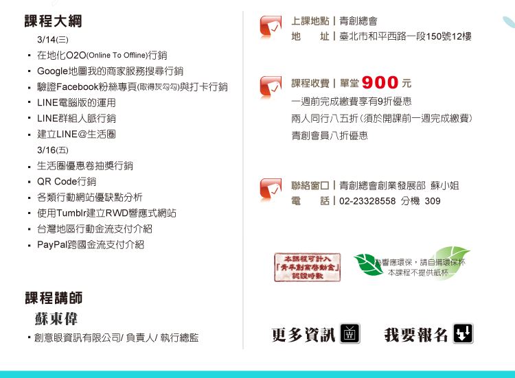 ☑ 單一課程超過1,000元以上,即贈送100元課程折價卷,可折抵下次青創學院課程費用