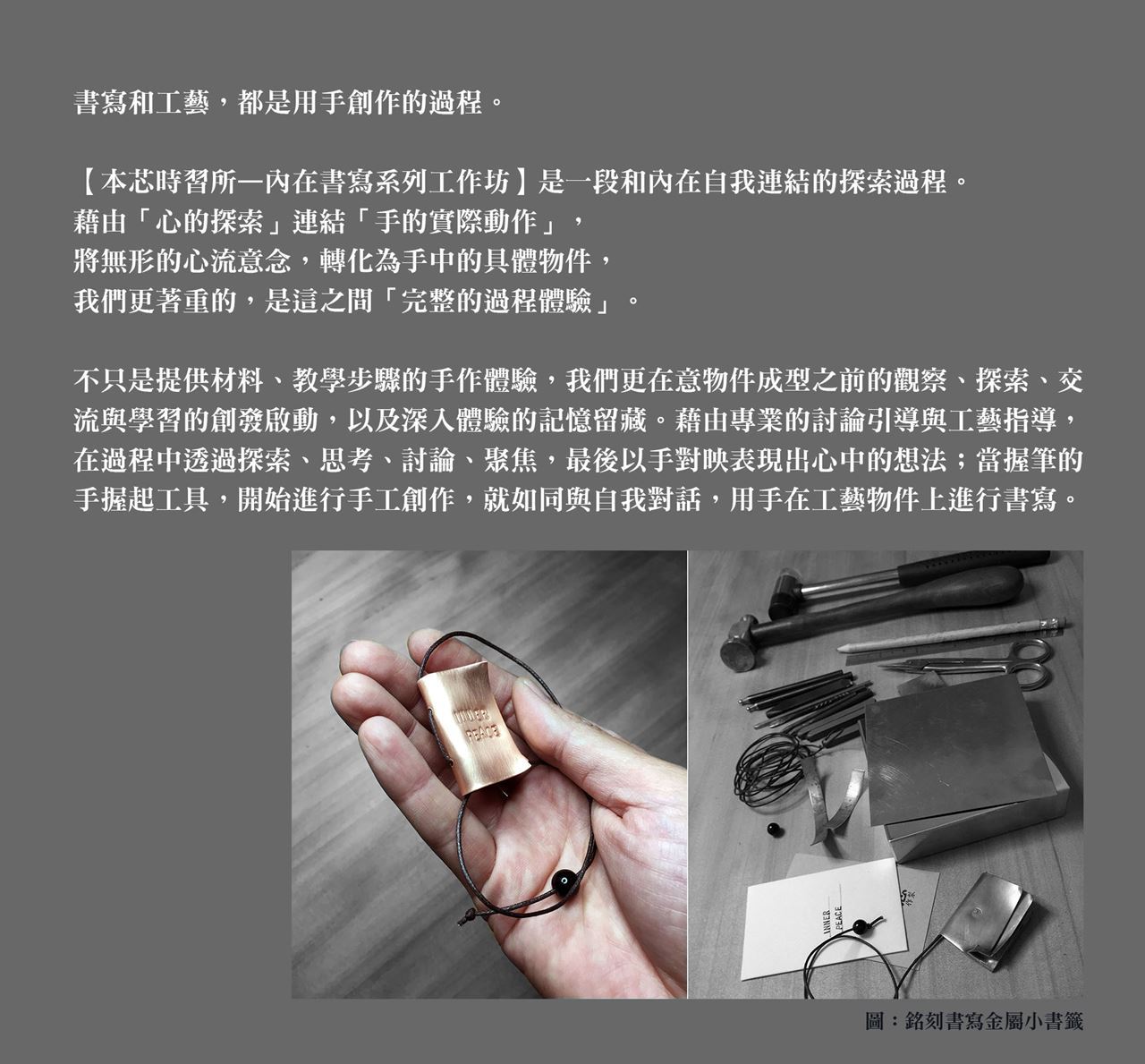 費用:單堂1,500元(包含專業討論導引、金工指導、體驗材料、工具及設備、小班制舒適環境、點心茶水)