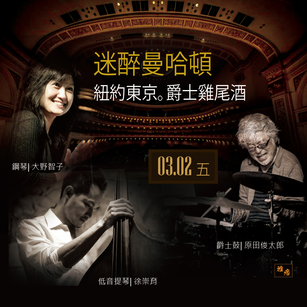 來自東京、活躍於紐約的爵士鋼琴家大野智子、爵士鼓原田俊太郎、金曲及金音獎得主低音提琴家徐崇育,帶來曼哈頓的自由與浪漫...