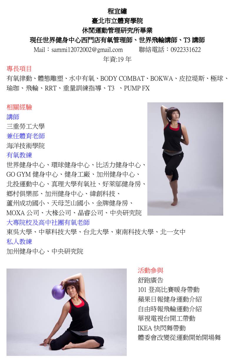 專長於瑜伽、極球、皮拉提斯、體態雕塑、水中有氧、有氧