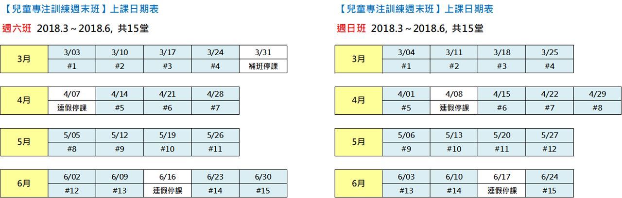 本學期3月~6月共排15堂課,週六&週日各開基礎班&進階班,各班訓練內容進度各不同,請家長擇一報名。
