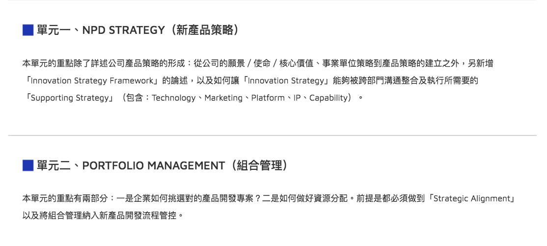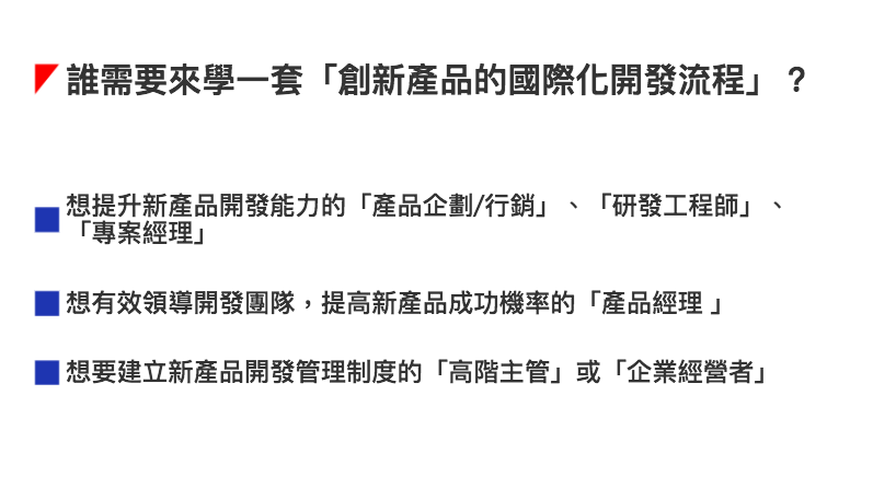 創新NPDP認證課程是根據PDMA所發展的「新產品開發管理知識體系」規劃而成,明確定義國際化產品經理必須具備「新產品開發策略 」、「新產品開發流程 」、「產品組合管理 」、「產品開發團隊組織管理 」、「產品開發工具與衡量指標 」、「市場研究方法 」等六大知識體,是國際化產品經理的共通專業語言及工作標準,全球500強企業中有超過70%企業採用此標準,是全球公認理論與實務結合的新產品開發管理Best Practice。