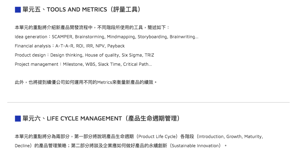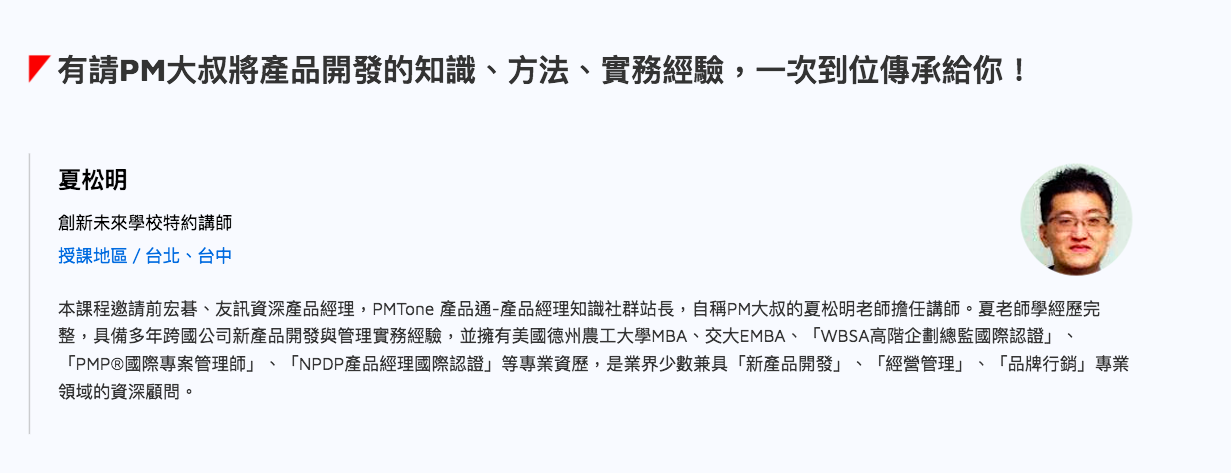 本課程邀請前宏碁、友訊資深產品經理,現任某管理顧問公司的夏松明總經理擔任顧問講師。夏老師學經歷完整,具備多年跨國公司新產品開發與管理實務經驗,並擁有美國德州農工大學MBA、交大EMBA、「WBSA高階企劃總監國際認證」、「PMP®國際專案管理師」、「NPDP產品經理國際認證」等專業資歷,是業界少數兼具「新產品開發」、「經營管理」、「品牌行銷」專業領域的資深顧問。