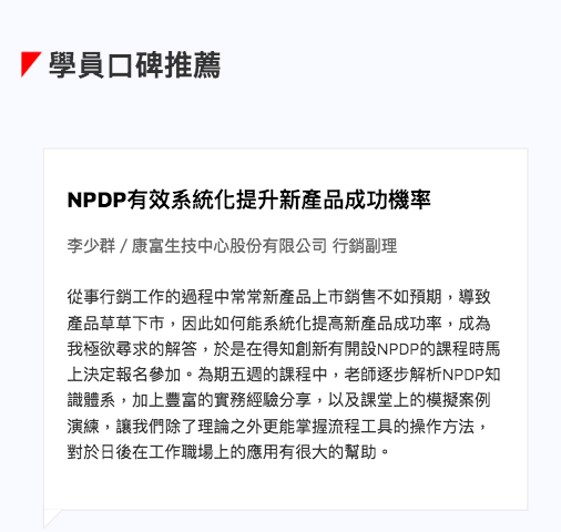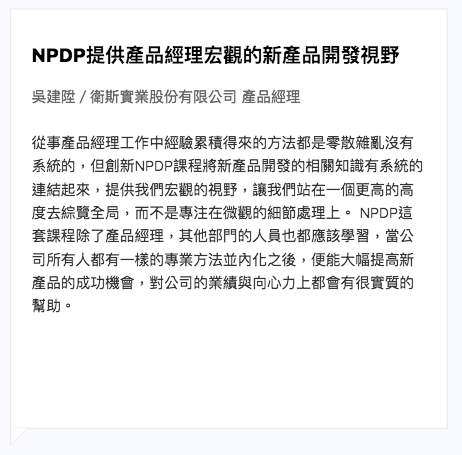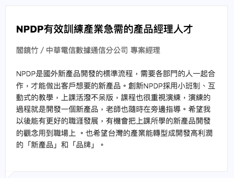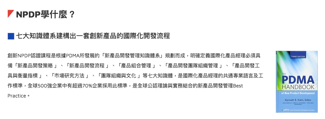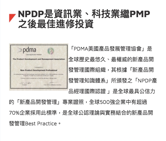 「PDMA美國產品發展管理協會」是全球歷史最悠久、最權威的新產品開發管理國際組織,其根據「新產品開發管理知識體系」所頒發之「NPDP產品經理國際認證 」是全球最具公信力的「新產品開發管理」專業證照,全球500強企業中有超過70%企業採用此標準,是全球公認理論與實務結合的新產品開發管理Best Practice。