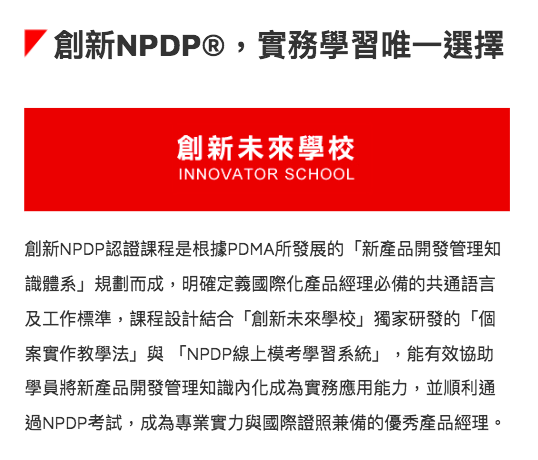 創新未來學校是「PDMA美國產品發展管理協會」在台合法授權的專業培訓中心,也是一所培育國際化產品經理的專門學校,課程目標是培育「實務與證照兼得」具備全球即戰力的優秀產品經理。創新NPDP認證課程是根據PDMA所發展的「新產品開發管理知識體系」規劃而成,明確定義國際化產品經理必備的共通語言及工作標準,課程設計結合「創新未來學校」獨家研發的「個案實作教學法」與 「NPDP線上模考學習系統」,能有效協助學員將新產品開發管理知識內化成為實務應用能力,並順利通過NPDP考試,成為專業實力與國際證照兼備的優秀產品經理。