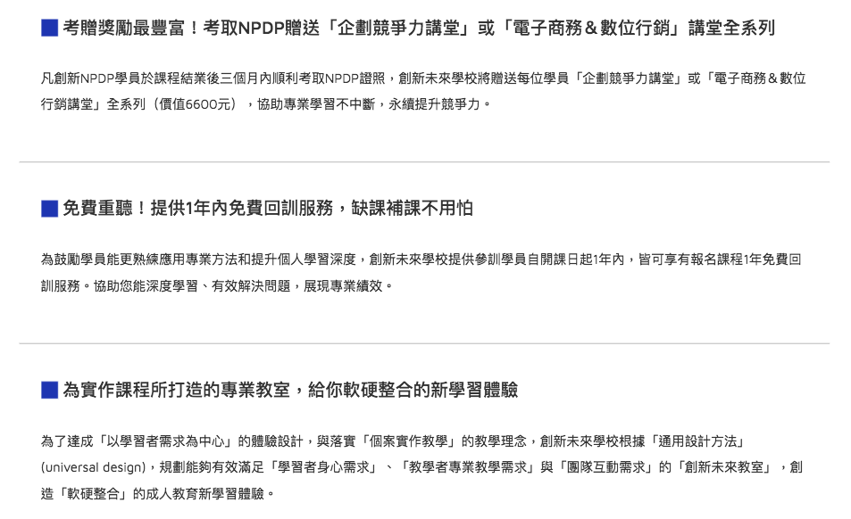凡創新NPDP學員於課程結業後三個月內順利考取NPDP證照,創新未來學校將贈送每位學員「企劃競爭力講堂」或「電子商務&數位行銷講堂」全系列16堂課(價值6600元),1年期間所有「專業經理人實戰系列課程」皆可無限量選修,協助專業學習不中斷,永續提升競爭力。