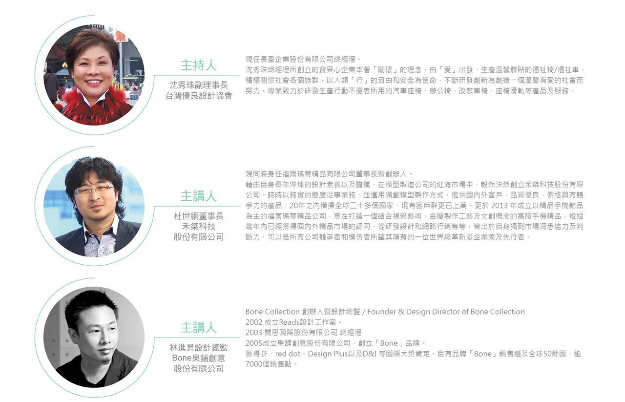 時間:5/8(二)13:00~17:15地點:醒吾科技大學商業設計系(新北市林口區粉寮路1段101號) 主題:傳授行銷戰術,打造創業品牌奇蹟! 主持人:沈秀珠副理事長 -台灣優良設計協會 主講人:杜世綱董事長 -禾桀科技股份有限公司主講人:林進昇設計總監 -果舖創意Bone創辦人大家期待已久的2018設計行銷論壇來囉!每位講者都是國內外業界佼佼者、各大企業領導!這次我們邀請到長盈企業總經理沈秀珠擔任主持人,長盈企業不斷研發創新為創造一個溫馨有愛的社會而努力!並且邀請到的兩位講師也是重量級!禾傑科技董事長-杜世綱在20年內橫掃全球二十多的國家,現有客戶群更已上萬,Bone果鋪創意總監-林進昇獲得IF、red dot、Design、D&I等國際大獎,銷售遍及全球50逾國,逾7000個銷售點。想掌握最新設計行銷趨勢嗎?~位置有限!現在就趕快報名吧!!!各場次海報請到這裡下載哦:https://goo.gl/FBDMdA6/6場次報名費新台幣三百元整;其他場次免報名費! 老師推薦五位學生即免費參加!學生皆免報名費!報名詳細資訊歡迎洽詢:台灣優良設計協會02-2653-3100gooddesigna@gmail.com指導:經濟部國貿局/主辦:台灣優良設計協會