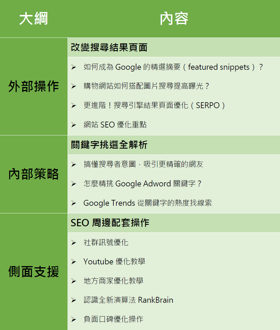 本次課程,邀請到資深SEO顧問孟令強老師,從行銷人策略發想的角色出發,避開難懂的技術與名詞,專注帶領大家認識更重要的策略思維。你將能更全面的學會運用在地商家、行動裝置的機制優化排名,並透過透過部落格和社群媒體SEO處理負面口碑,而最核心的關鍵字策略及更進階的SERPO(搜尋結果頁面優化),也將在本堂課全面剖析!