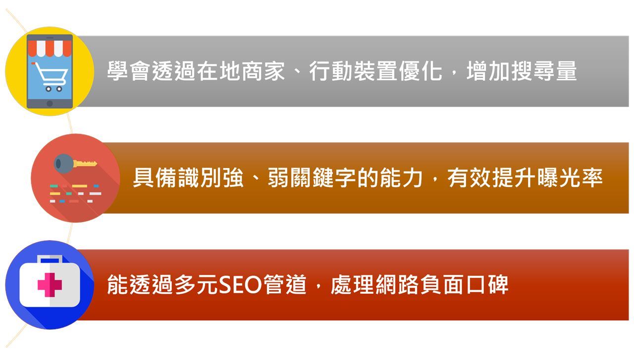 本次課程,邀請到資深SEO顧問孟令強老師,從行銷人策略發想的角色出發,帶領大家認識更重要的策略思維。你將能學會運用在地商家、行動裝置的機制優化排名,並透過透過部落格和社群媒體SEO處理負面口碑,而最核心的關鍵字策略及更進階的SERPO(搜尋結果頁面優化),也將在本堂課全面剖析!