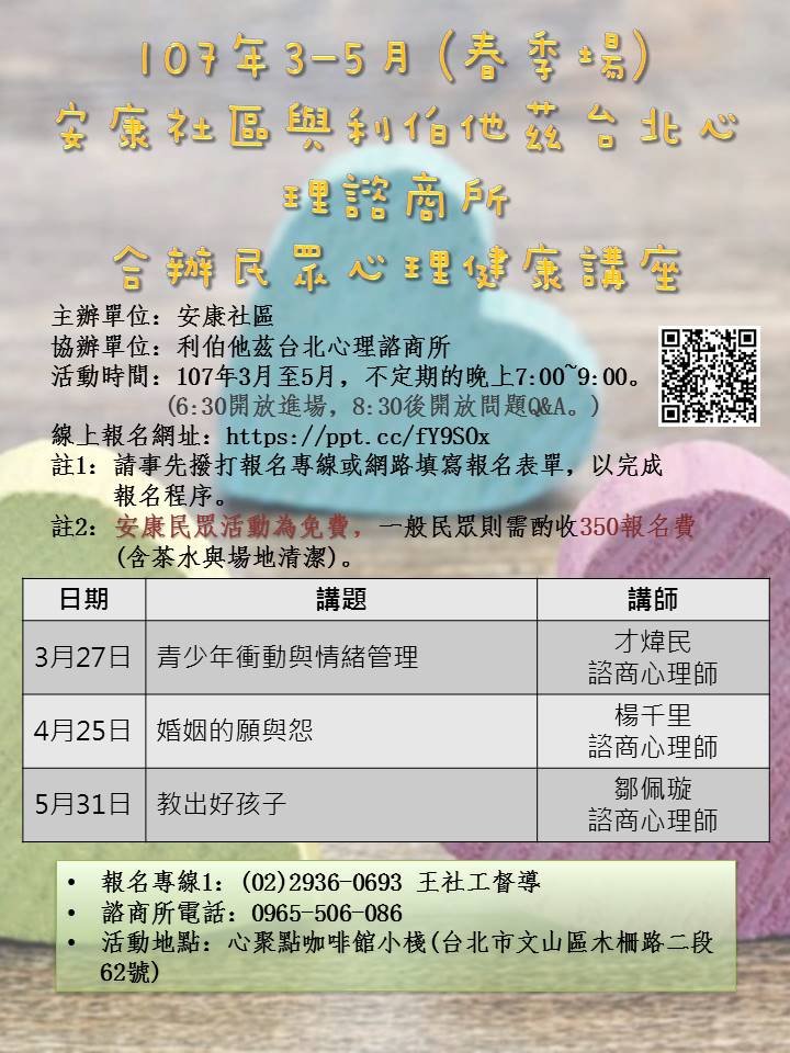 ● 一般民眾一堂350元(含茶水與場地清潔),安康民眾免費參加