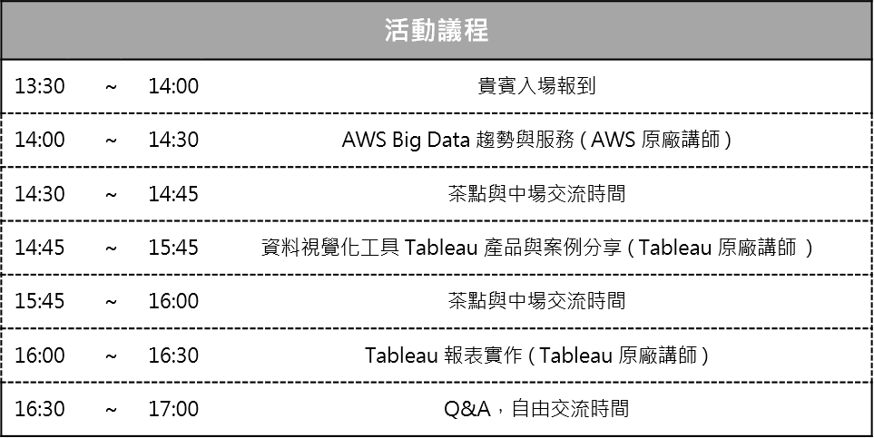 大數據 (Big Data) 分析可幫助您運用現有資料找出重大的洞察資訊,協助企業縮短決策時間,甚至改變決策的思維;雲端服務,則可讓您以最高的彈性、最佳的成本效益、最少的 IT 專業技術與人員需求,快速地運用新興技術和應用;而良好的資料視覺化工具,則能幫您在短時間內一眼看出問題所在、並將數據洞察與他人分享。本次研討會將與您分享如何結合 AWS 雲端服務與 Tableau 資料視覺化工具,洞察出數據中無數的商機與發展!