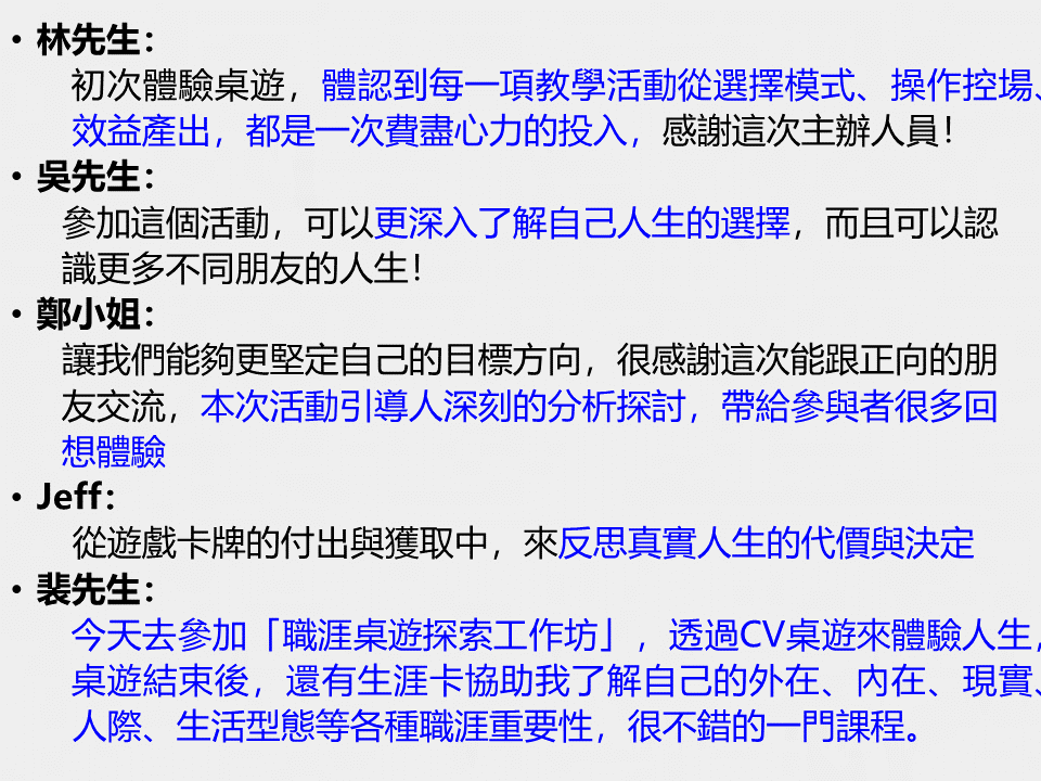 一般的桌遊活動會比較著重在娛樂性質,而工作坊是帶有方向與目的來做課程設計,在本工作坊中,桌遊體驗是其中一環,體驗完畢之後會帶大家深入探討職涯相關議題,並且帶領大家做產出!