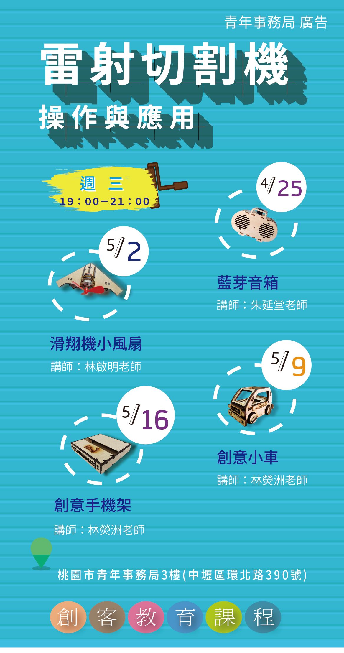 課程地點:桃園市青年事務局3樓 青創指揮部 創客教室(中壢區環北路390號3樓)