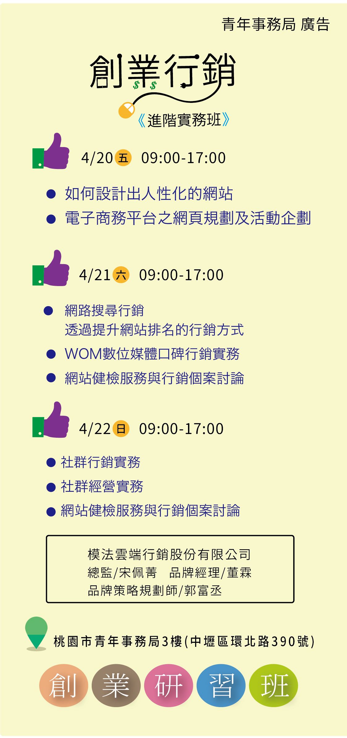 - 課程地點:桃園市青年事務局3樓(中壢區環北路390號) 青創指揮部