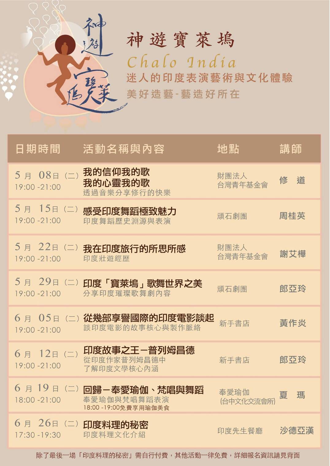 這次由臺中市東亞文化藝術交流協會主辦,一系列的印度文化藝術講座,透過8場不同主題的活動,包含:音樂、舞蹈、旅遊、歌舞劇、瑜珈、電影、文學、美食,經歷視、聽、嗅、味、觸五感的多重享受,沉浸於印度文化和藝術迷人的魅力之中!