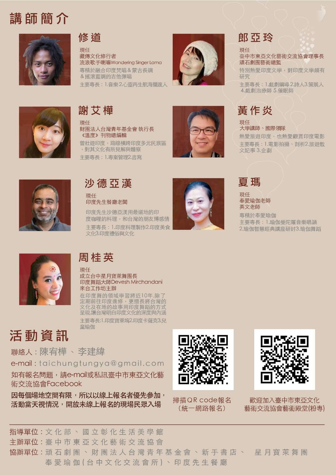 ◇協辦單位:頑石劇團、財團法人台灣青年基金會、新手書店、奉愛瑜珈(台中文化交流會所)、印度先生餐廳