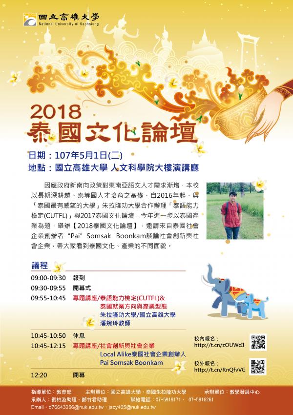 然而,學語文更需了解該國的國情與文化,故本校與曼谷被尊為「泰國最有威望的大學」朱拉隆功大學合作辦理「2018泰國文化論壇」,提供與會者看到泰國文化的不同面貌,提升多元文化素養。