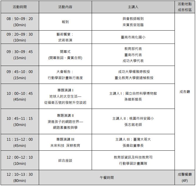 會議地點:國立成功大學:上午場→成杏校區/ 成杏廳,下午場→光復校區 ● 第一演講室 ● 第二演講室 ● 第三演講室 ● 多功能廳 ● 國際會議廳