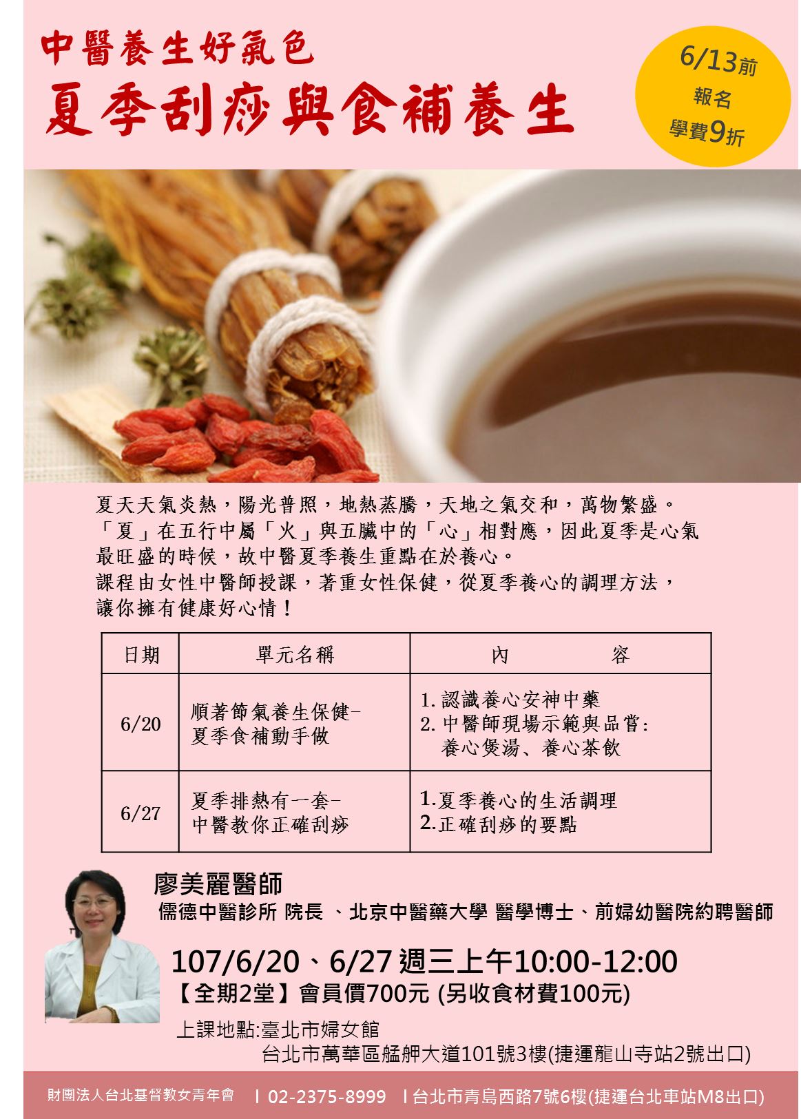 線上報名 :http://www.ywca-taipei.org.tw/edu/lift357.htm<<台北基督教女青年會*台北婦女館>> 報名專線:02-2375-8999 上課地點:台北婦女館 台北市萬華區艋舺大道101號3樓(捷運龍山寺站2號出口)