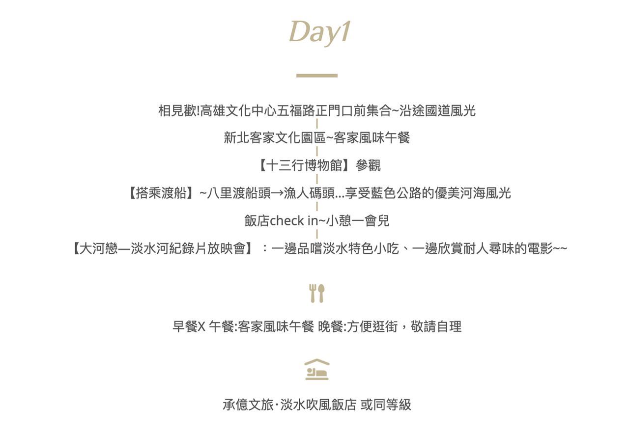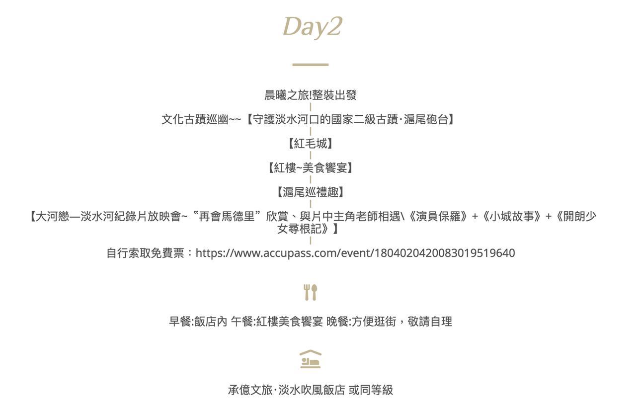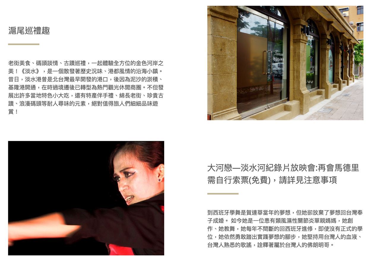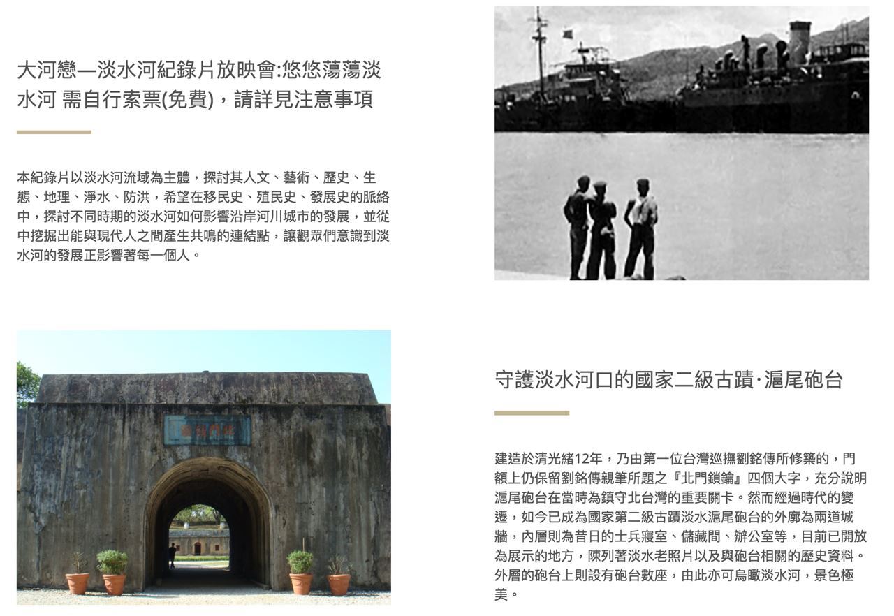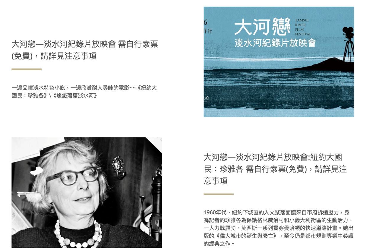 - 大河戀—淡水河紀錄片放映會為免費活動性質,參加旅客須自行至活動通Accupass自行索票,秘樂旅行社不保證有票,建議旅客提早搶票:紐約大國民:珍雅各、悠悠蕩蕩淡水河、再會馬德里、《演員保羅》+《小城故事》+《開朗少女尋根記》。