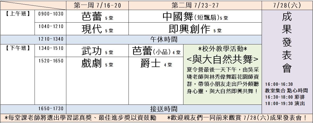 | ▲上課日期:7/16(一)-7/27(五)& 7/28(六)1600-1930成果發表會歡迎踴躍報名! ▲招生對象:【全天班、單周班】:升小二~小六 無基礎可 【上午班、下午班、單科/雙科班】:升小一~小六 無基礎可 ▲報名費用: 【全天班】18000元/40堂;附午餐,提供午睡空間(需自備睡袋),贈送中國舞道具;贈送舞衣/水褲二選一 【上午班/下午班/單周班】9500元/20堂;單周班附午餐;如上中國舞需酌收道具費200元;贈送舞衣/水褲二選一 【單科/雙科班】以一科3000元/5堂計;如上中國舞需酌收道具費200元 |