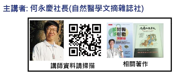 現代人生病了除了看醫生吃藥還能做甚麼? 如何啟動身體的自癒力? 廚房即是藥房? 本課程特別邀請「自然醫學專家何永慶社長」來告訴我們從自然醫學的角度如何運用廚房所提供的食物來輔助我們全家人健康的維持。心血管疾病﹑三高﹑新陳代謝疾病要怎麼吃? 吃什麼?
