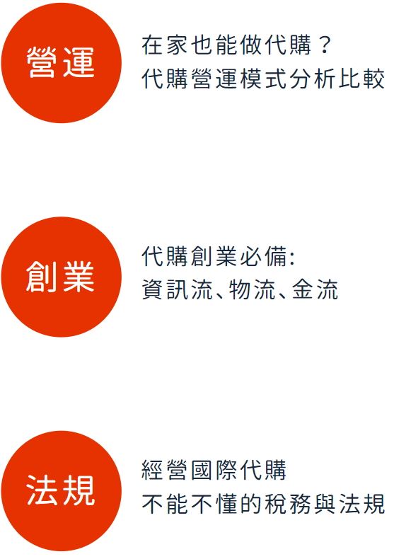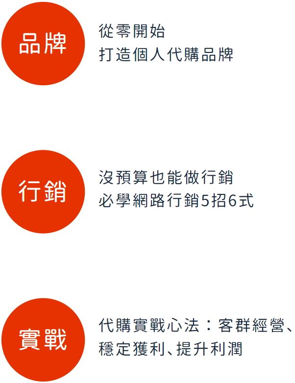 6小時的精實課程將直指代購經營的核心,有架構的傳授包含代購市場趨勢、國際物流、網路行銷、稅務法規等經營代購一定要知道的know-how,實用的課程教學內容希望幫助有志成為專業代購的你,減少摸索的過程與時間的浪費,快速打造出自己的代購品牌及長久經營的事業。